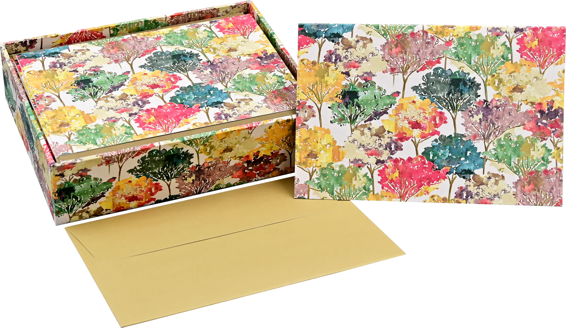 Autumnal hues are the focus of these elegant note cards, with an image of vibrant trees set above a matching border. Premium boxed stationery set comes with 14 note cards...