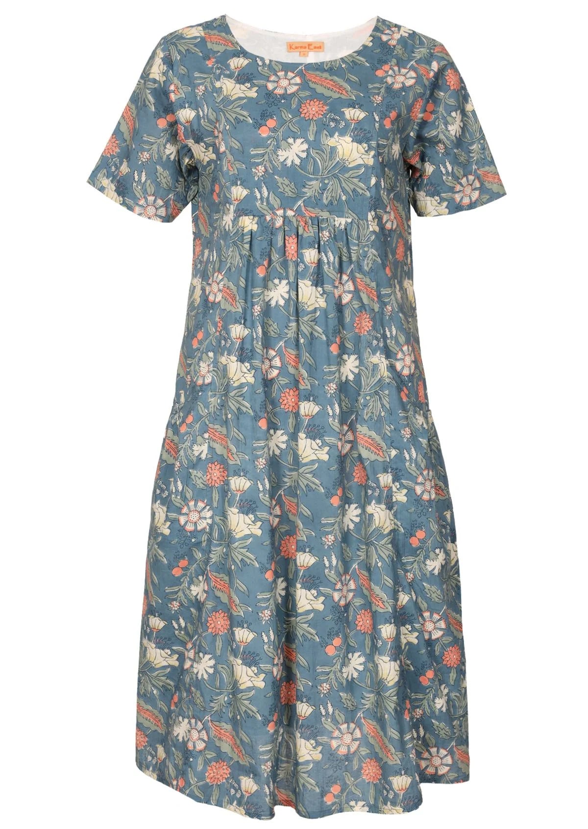 The Frankie Dress is a staple at Karma East. A lovely loose-fitting style crafted from 100% cotton, and comes in our beautiful Sage print with grey Indian florals on green...